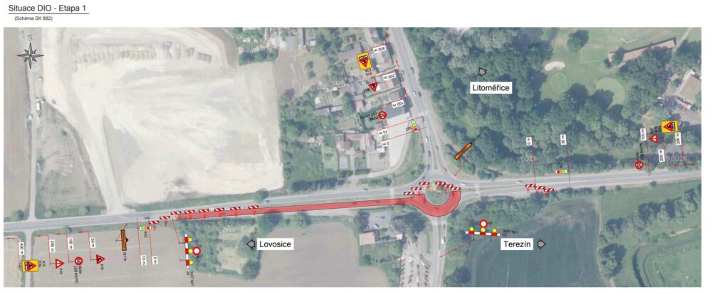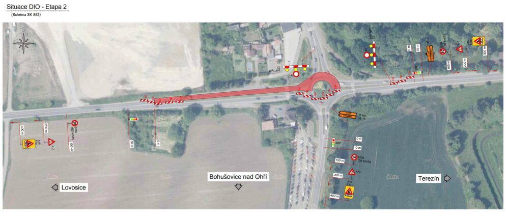Provoz bude veden kyvadlově a řízen semafory. V jednotlivých etapách dojde k uzavření větve směrem na Bohušovice a na Litoměřice, doprava bude odkloněna po objízdných trasách. Dokončení prací je plánováno na konec října 2025.