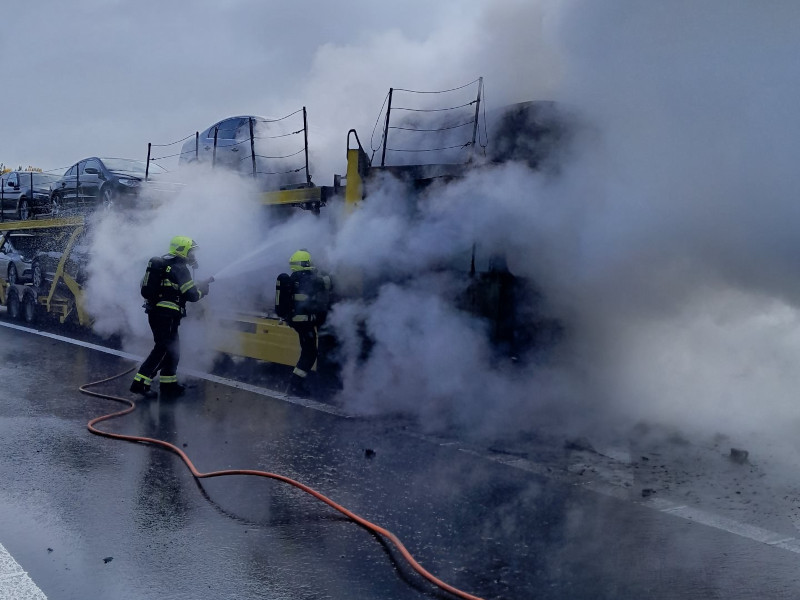 Knínice - Ve čtvrtek 10. října vyjížděly tři jednotky hasičů k požáru kamionu převážející osobní auta na sjezdu Knínice z dálnice D8 ve směru na Ústí nad Labem. Na místo hasiči vyjížděli přesně v poledne.