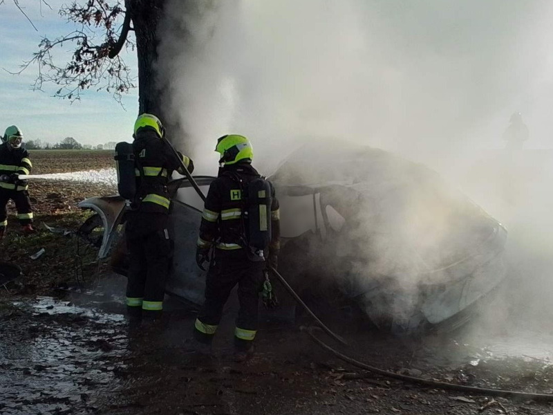 Střížovice - Tři jednotky hasičů vyjížděly v pondělí 8. prosince v dopoledních hodinách k požáru osobního automobilu po nárazu do stromu na silnici č. 2691 u Střížovic na Litoměřicku. Krajské operační a informační středisko vyslalo jednotky hasičů na základě automatického volání telefonu z místa nehody.