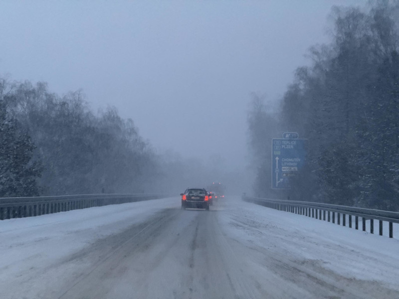 Hory – silnice I/6: Výrazné problémy jsou hlášeny z horských poloh. Od půl sedmé ráno je částečně uzavřen provoz u obce Křimov (nedaleko Hory Svatého Šebestiána). V pravém jízdním pruhu ve stoupání stojí kolona vozidel, příčinou je husté sněžení.
