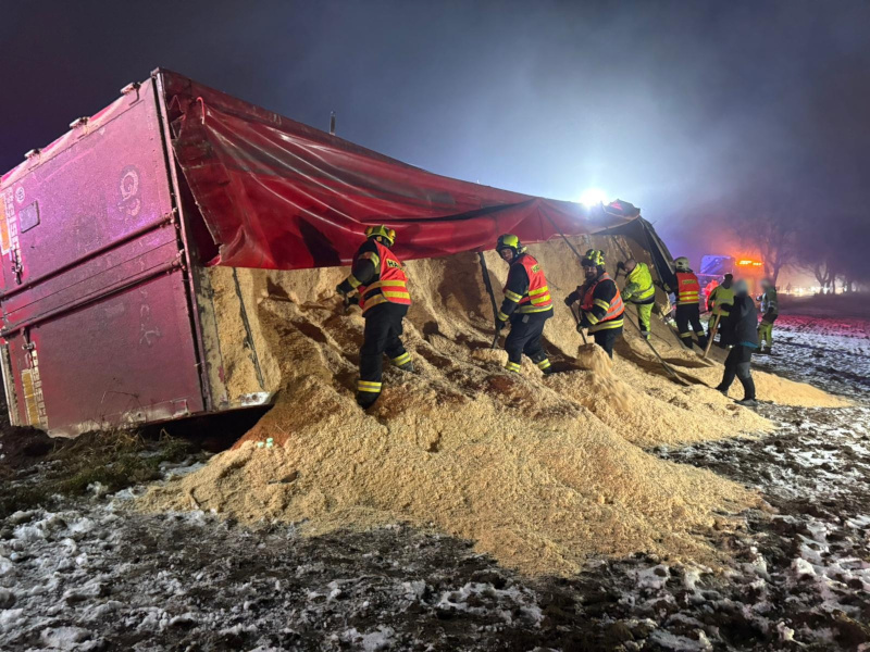 Po odlehčení soupravy se odtahovým službám podařilo kamion postavit zpět na kola a vytáhnout jej na komunikaci. Následně proběhl úklid vozovky a odstranění následků nehody. Zásah byl ukončen ve čtvrtek 16. ledna 2026 v 4:07 hodin ráno.