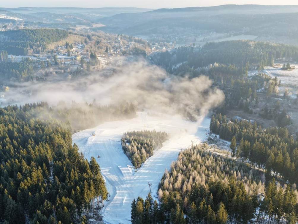 Takhle mohou pozorovat sjezdovku v Potůčkách ptáci. Zdejší borci neváhají ani v dubnu pustit sněhová děla. Foto: SKIPOT Potůčky