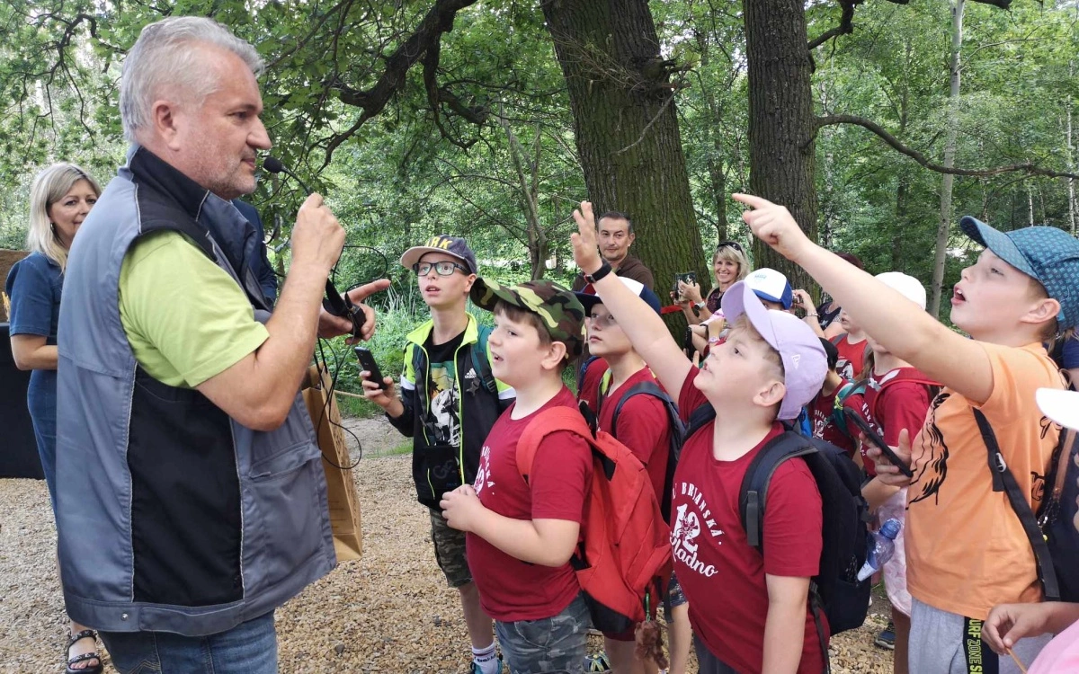 Chovatel si vyzkoušel, co všechno děti o dikobrazech znají. Odměnil je propagačními předměty chomutovského zooparku. Foto: jip