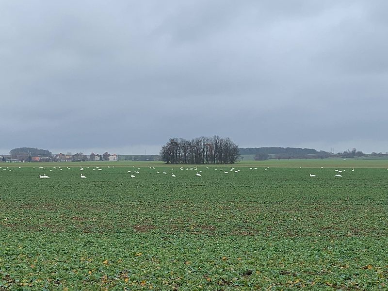 Na polích labutě nejčastěji hledají zbytky po sklizni nebo mladé ozimy, které jsou pro ně bohatým zdrojem energie potřebné k přečkání chladných měsíců.